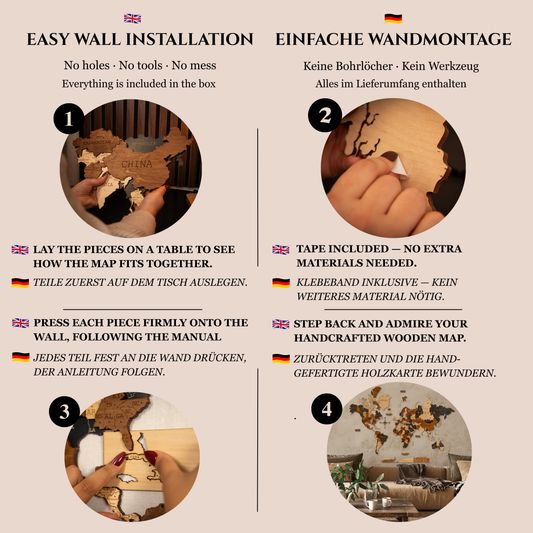 The map arrives as a precision-cut puzzle, designed to be assembled directly on your wall. Each piece fits together clearly and intuitively, allowing you to create the full map step by step. This approach ensures accurate placement, easy handling during installation, and a clean, professional final result.